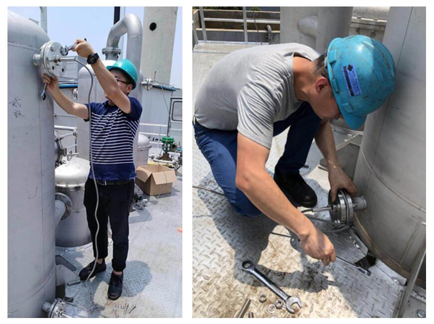 江蘇吳江的某大型污水處理廠是此次米科江蘇辦事處李工上門服務(wù)的地方。時(shí)值端午,工廠基本也都停止了工作,但是污水處理蒸發(fā)器的罐子前面卻聚集了好幾位技術(shù)人員。