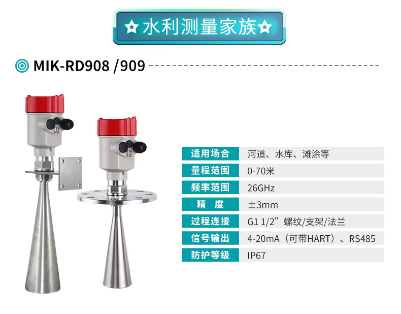 米科MIK-RD908雷達(dá)水位計(jì),26G高頻系列可用于需要發(fā)射角度小精度高的場合,一般5米以上用。