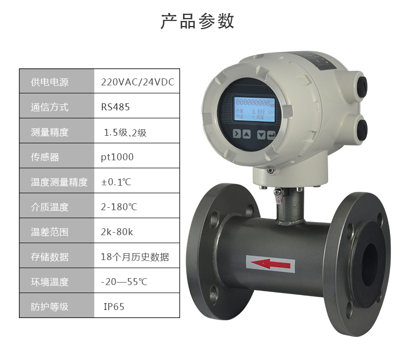 13758257245電磁熱量表主要是對熱交換系統(tǒng)中載能介質(zhì)(液體水)的供水溫度、回水溫度及瞬時流量進行實時測量,并按照熱力學(xué)能量計算公式,對系統(tǒng)消耗的冷量或熱量值進行計算并保存的裝置。其中電磁式流量傳感器是通過法拉第電磁感應(yīng)定律,將瞬時流量信號線性的變化為感應(yīng)電動勢這一電信號,從而得到瞬時流量信號。計算器將流量信號與溫度傳感器采集的溫度信號進行積算,得出我們需要的能量值。