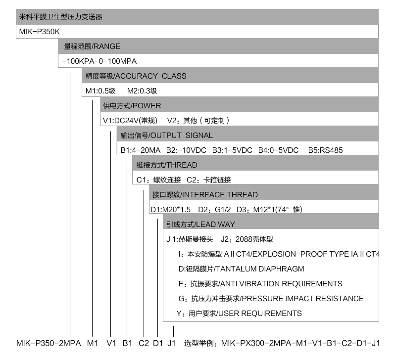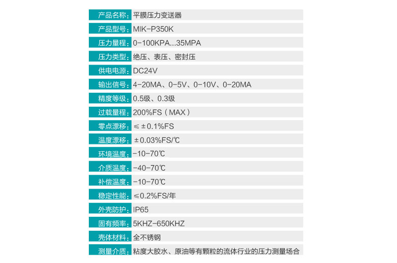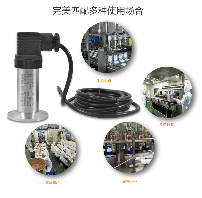 適用場合:MIK-P350系列平面膜結(jié)構(gòu)壓力變送器選用德國進口擴散硅芯體,采用平面膜直接感受壓力。傳感器接口有卡箍式,M27×2,法蘭式可供選擇。輸出信號有電壓、電流、頻率信號等可選擇,傳感器平膜片防止了結(jié)垢,不衛(wèi)生及粘稠液體堵塞等問題。廣泛應(yīng)用于食品、醫(yī)藥、衛(wèi)生及釀酒工業(yè)等部門。