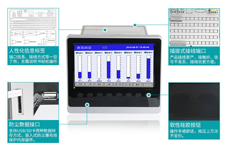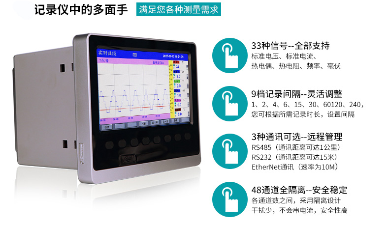 適用場(chǎng)合:米科MIK-R6000C系列彩色無(wú)紙記錄儀,可同時(shí)記錄標(biāo)準(zhǔn)電壓、標(biāo)準(zhǔn)電流、熱電偶、熱電阻、頻率、毫伏等信號(hào)??蓭?8路報(bào)警輸出,12路變送輸出,RS232/485通訊接口,以太網(wǎng)接口,微型打印機(jī)接口和USB接口,SD卡插座;