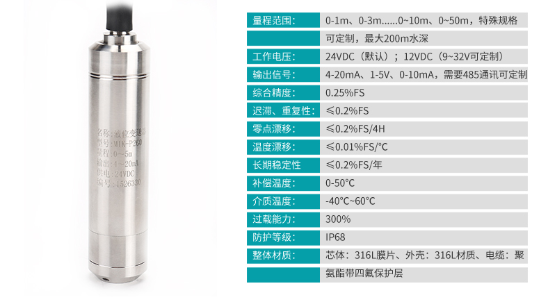 適用場合:投入式液位變送器是基于所測液體靜壓與該液體高度成正比的原理,采用擴(kuò)散硅或陶瓷敏感元件的壓阻效應(yīng),將靜壓轉(zhuǎn)成電信號。經(jīng)過溫度補(bǔ)償和線性校正。轉(zhuǎn)換成4-20mADC標(biāo)準(zhǔn)電流信號輸出。投入式液位變送器的傳感器部分可直接投入到液體中,變送器部分可用法蘭或支架固定,安裝使用極為方便。